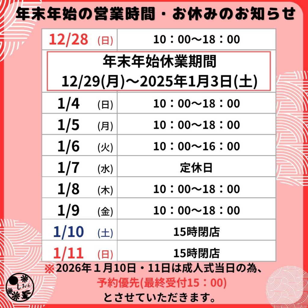 HOME BLOG お知らせ 年末年始の営業時間・休業期間のお知らせ 年末年始の営業時間・休業期間のお知らせ 2025.11.14お知らせ ご不便をおかけいたしますが、ご了承の程よろしくお願いいたします。 Tweet Share Hatena Pocket RSS feedly Pin it この記事のタイトルとURLをコピーする お知らせ お休みのお知らせ2025年11月