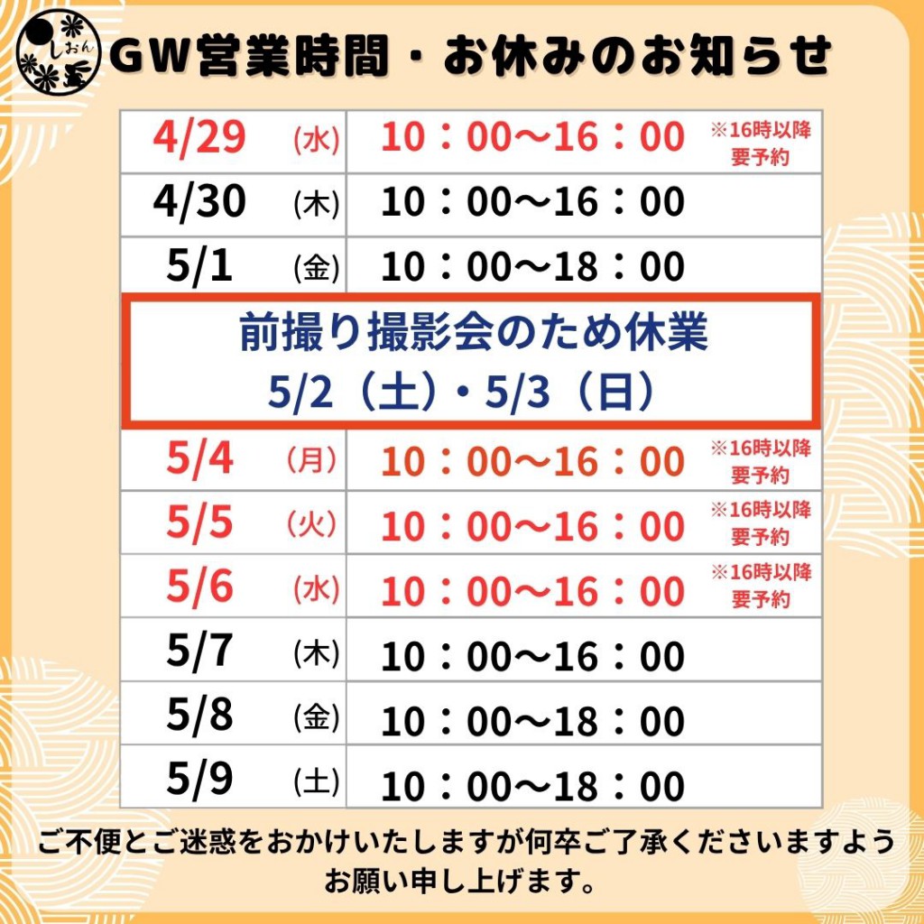HOME BLOG お知らせ 2026年GW営業時間のお知らせ 2026年GW営業時間のお知らせ 2026.04.22お知らせ 誠に勝手ながら前撮り撮影会の為、 5月2日(土)・3日(日)の2日間 お休みとさせていただきます。 ご了承くださいませ。 Tweet Share Hatena Pocket RSS feedly Pin it この記事のタイトルとURLをコピーする お知らせ 健康チェック体験会